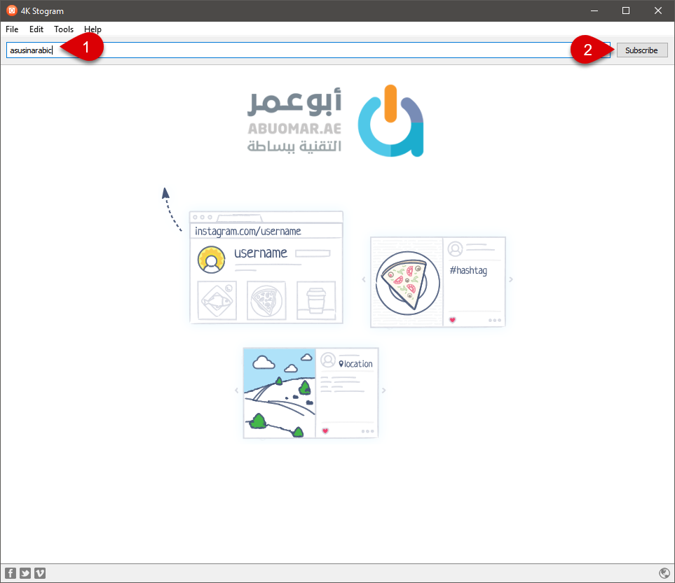 بعد ذلك وضمن المستطيل في أعلى البرنامج اكتب اسم المستخدم الخاص بالحساب الذي تريد تحميل الصور الخاصّة به أو يمكنك تحميل صور أو فيديوهات من هاشتاغ # معيّن أو مكان أو موقع معيّن أيضاً