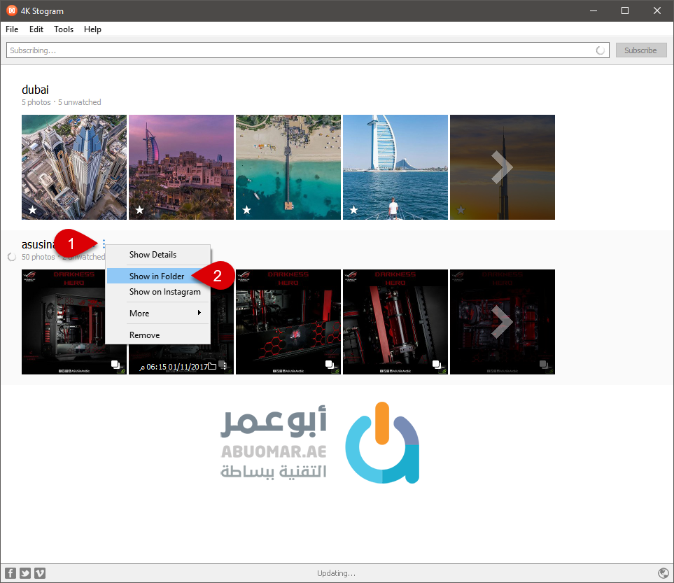 سيتم تحميل الفيديوهات والصور لهذه الحسابات تلقائيّاً وسيتم وضعها في الصفحة الرئيسية للبرنامج