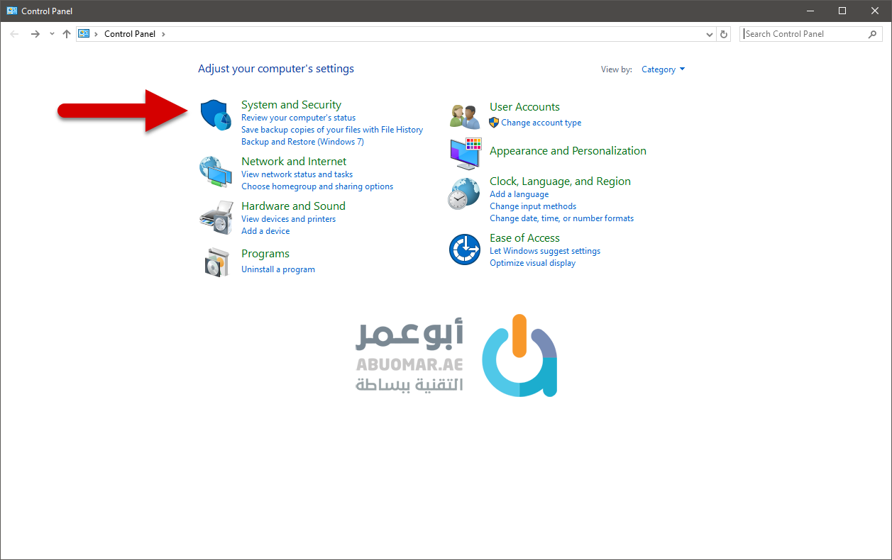 1. في البداية اذهب إلى لوحة التحكّم Control Panel واختر System and Security