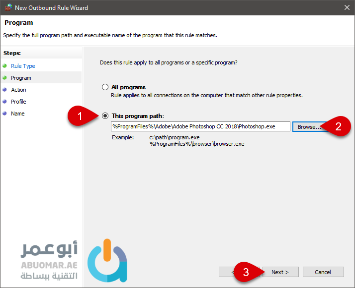 7. بعد ذلك اختر خيار This program path واضغط على Browse واختر الملف التنفيذي للبرنامج المطلوب