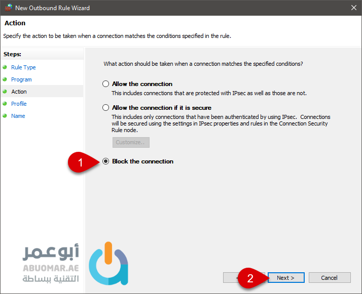 8. قم باختيار خيار Block the connection وبعد ذلك اضغط على Next