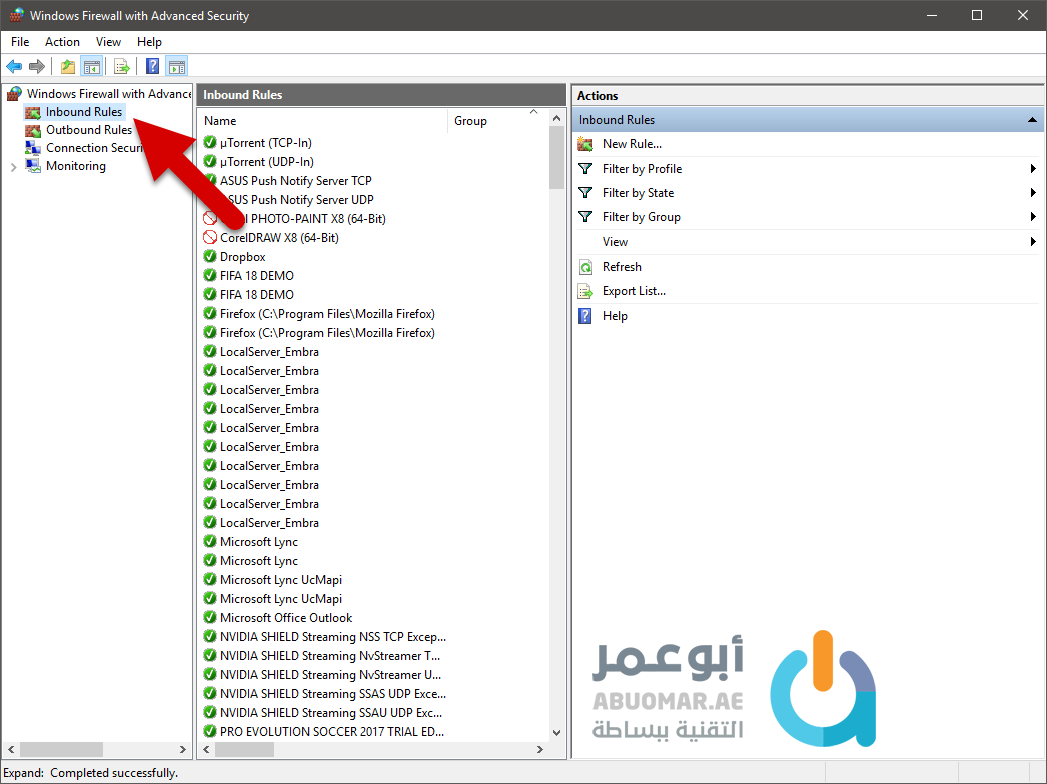 11. قم بتكرار العمليّة أيضا ولكن استبدل الخطوة الرابعة باختيار خيار Inbound Rules مع تطبيق جميع الخطوات السابقة تماماً