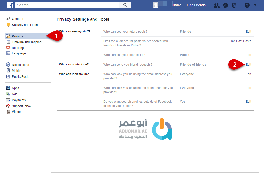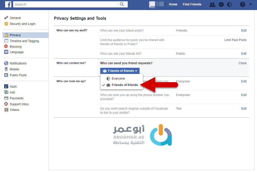 يمكنك بكل بساطة في حال واجهت مشكلة مشابهة في فيسبوك من منع الآخرين من إرسال طلب صداقة لحسابك في فيسبوك من خلال التعديل على خيارات الخصوصية في الموقع من خلال اتباع الخطوات التالية.