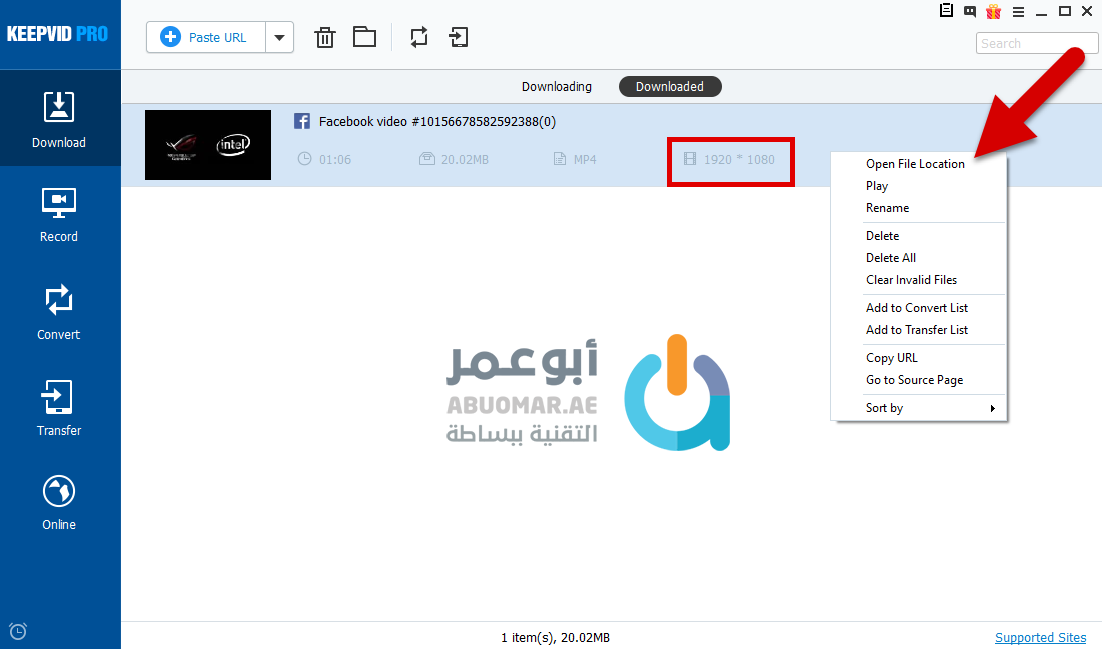 اضغط بزر الفأرة الأيمن على الفيديو بعد تحميله في قسم Downloaded واختر Open File Location لتذهب إلى مجلّد الفيديو مباشرة وكما تلاحظ تم تحميله بأعلى دقّة ممكنة 1080*1920