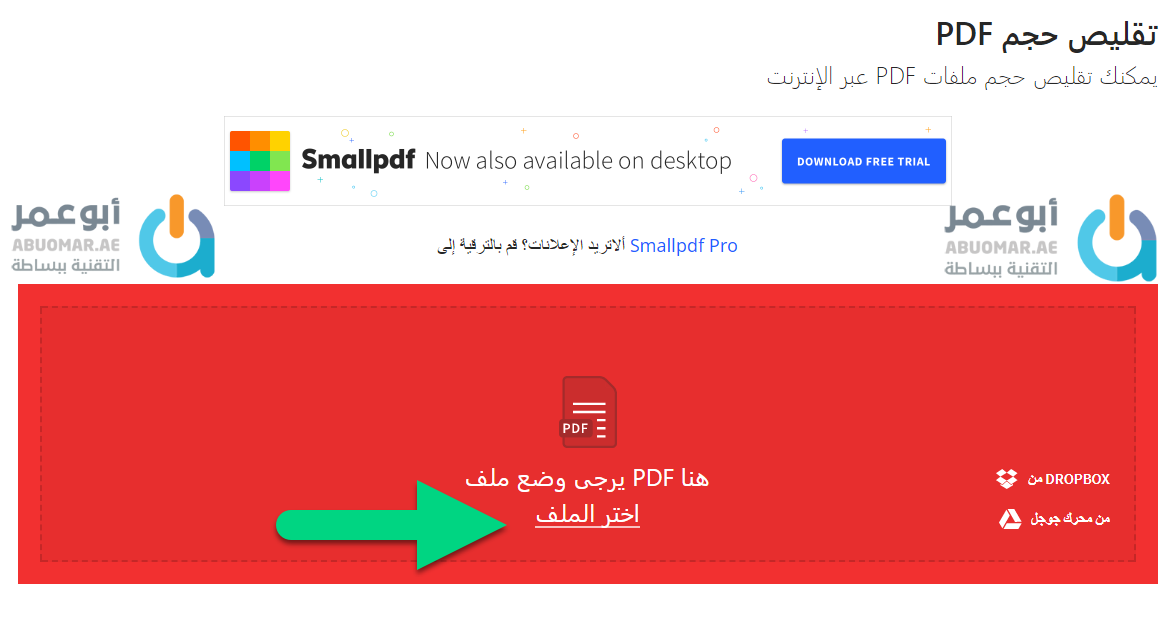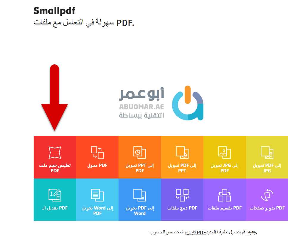 في البداية توجّه لموقع smallpdf من الرابط التالي بالضغط هنا وهو موقع عربي بالكامل واضغط على تقليص حجم ملف PDF