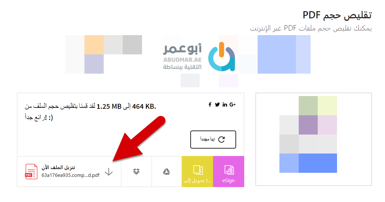 وفي مثالنا كما تلاحظ تم تقليص حجم الملفّ من 1.25 ميغا إلى 464 كيلو بايت فقط فاضغط على تنزيل الملف الآن لتحميل الملف ذو الحجم الصغير