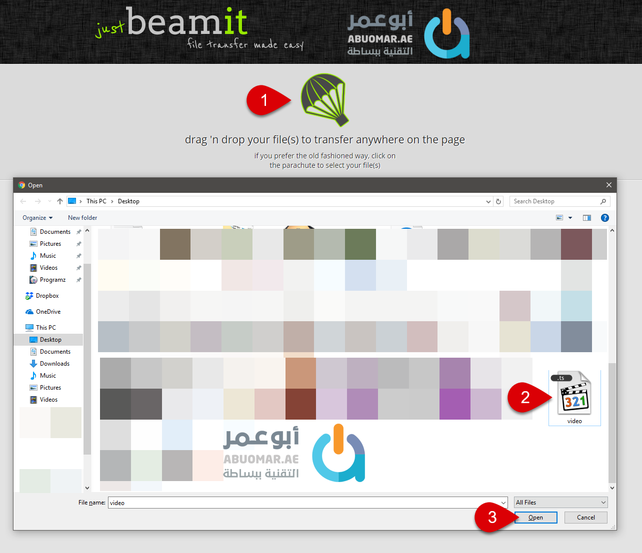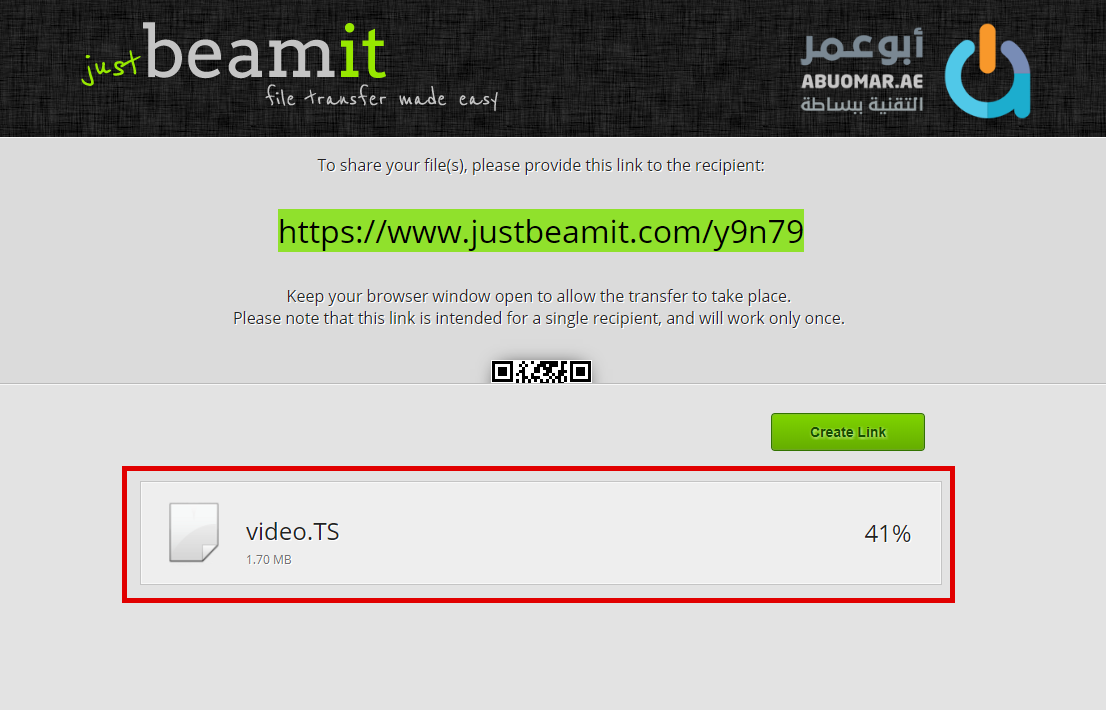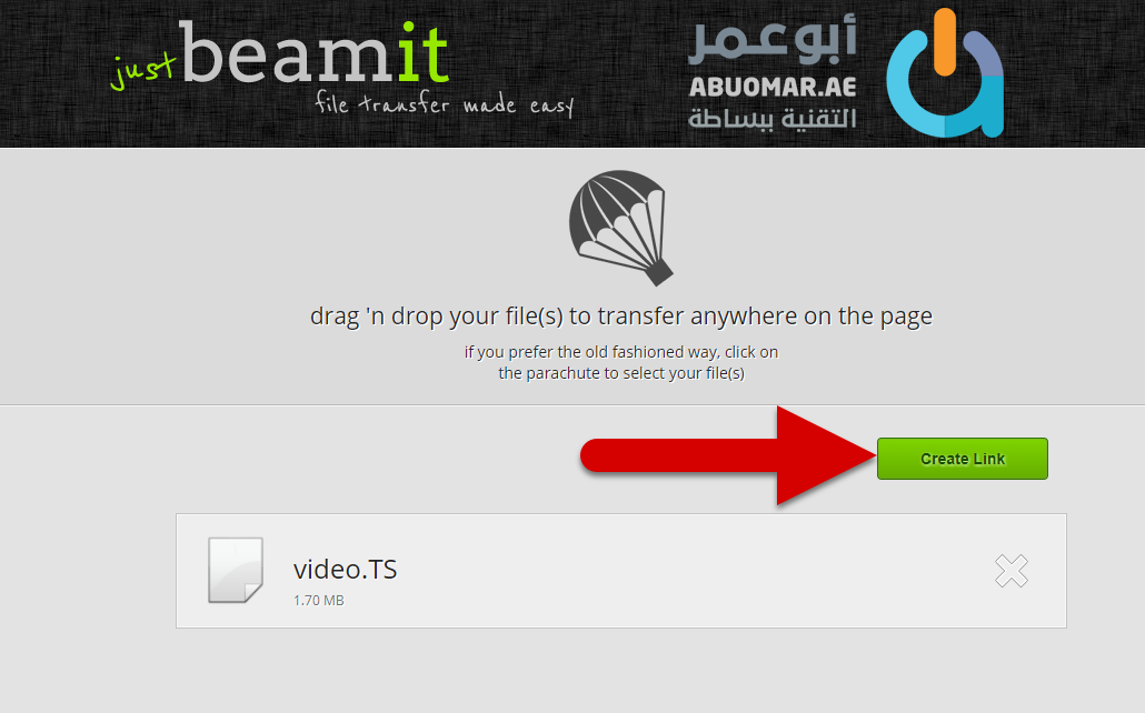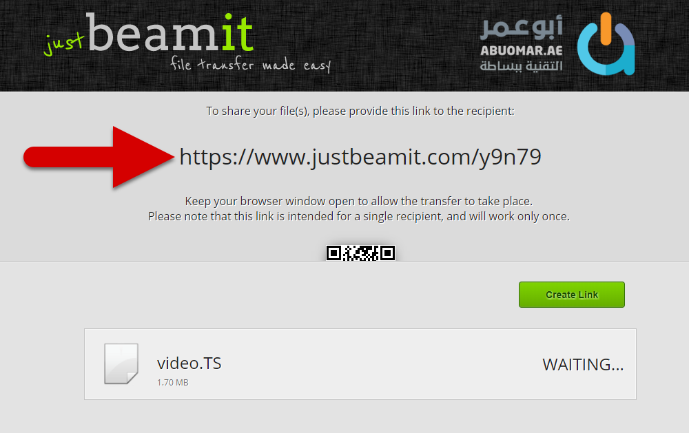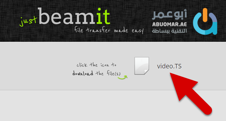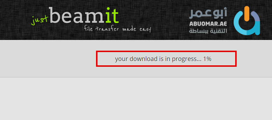 في البدايو قم بالذهاب إلى موقع www.justbeamit.com من خلال الرابط التالي بالضغط هنا وهو موقع مختصّ برفع ومشاركة الملفّات من خلال مباشرة دون أي تعقيدات تذكر وسيتم حذف رابط التحميل مباشرة بعد تحميل الملف من قبل المستقبل