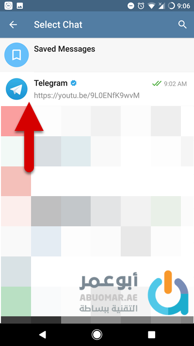 بعد ذلك اختر محادثة ما لإرسال الفيديو إليها وأنصحك باستخدام المحادثة الشخصية “الرسائل المحفوظة saved messages” الخاصة بك، وهي مساحة سحابية يُمكنك من خلالها تخزين الوسائط والمعلومات والملفات.