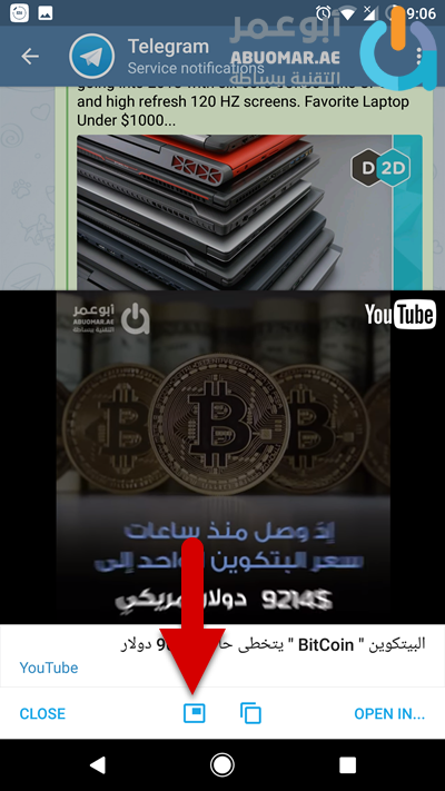ولكن يمكنك أيضاً مشاهدة فيديوهات يوتيوب في نافذة عائمة وتشغيل يوتيوب في الخلفيّة من خلال الضغط على الزر الموضّح في الصورة