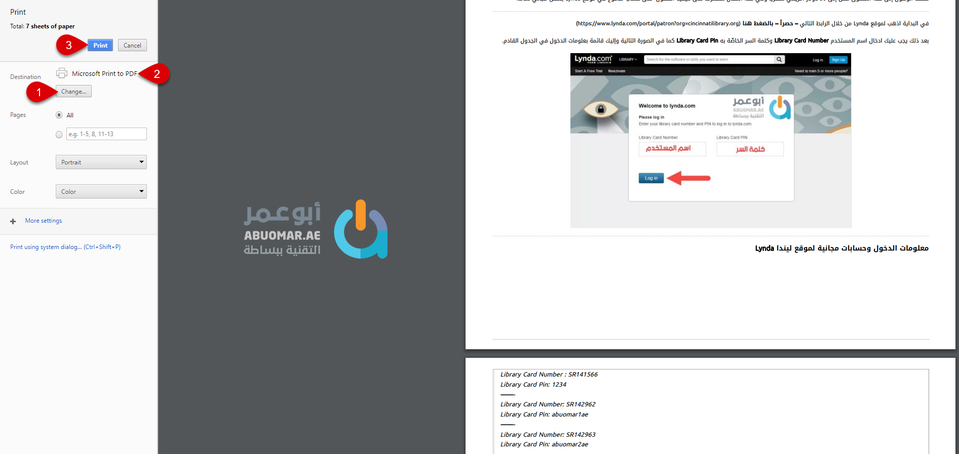 ضمن خيارات الطباعة اختر Microsoft Print To PDF وذلك بتغييرها من زر Change وكخطوة نهائيّة اضغط على Print