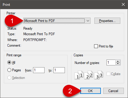 ضمن خيارات الطباعة اختر Microsoft Print To PDF من القائمة المنسدلة وكخطوة نهائيّة اضغط على Ok