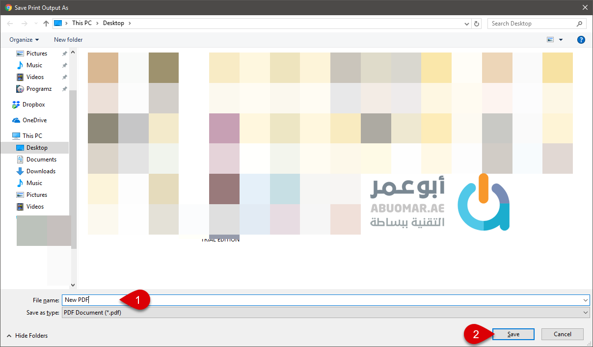 الآن قم باختيار اسم لملف PDF الجديد واختر مكان حفظه ومن ثم اضغط Save