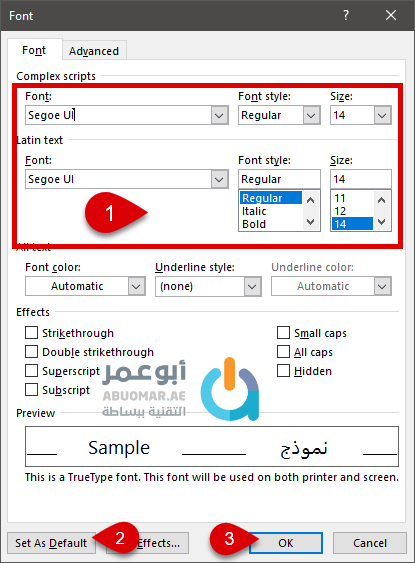 قم باختيار الخط المطلوب وحجمه وبعد الانتهاء اضغط على Set as default لتعيين الخط الجديد كخط افتراضي في برنامج وورد Word