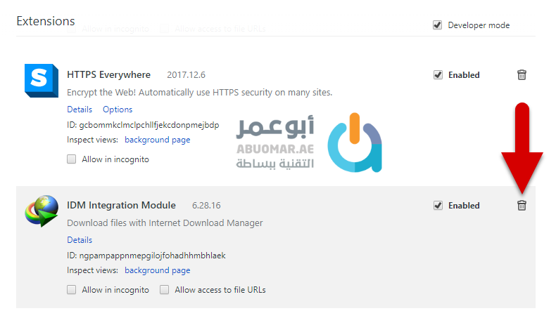 ابحث عن إضافة برنامج انترنت داونلود منجر وقم بحذفها بالضغط على زر المهملات بجانبها