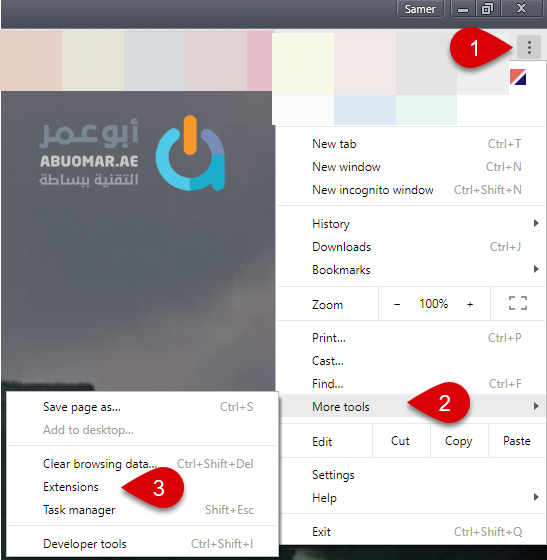 في البداية انتقل لقسم الإضافات في متصفّح جوجل كروم من خلال الضغط على زر القائمة واختيار خيار More Tools بعد ذلك الإضافات Extensions