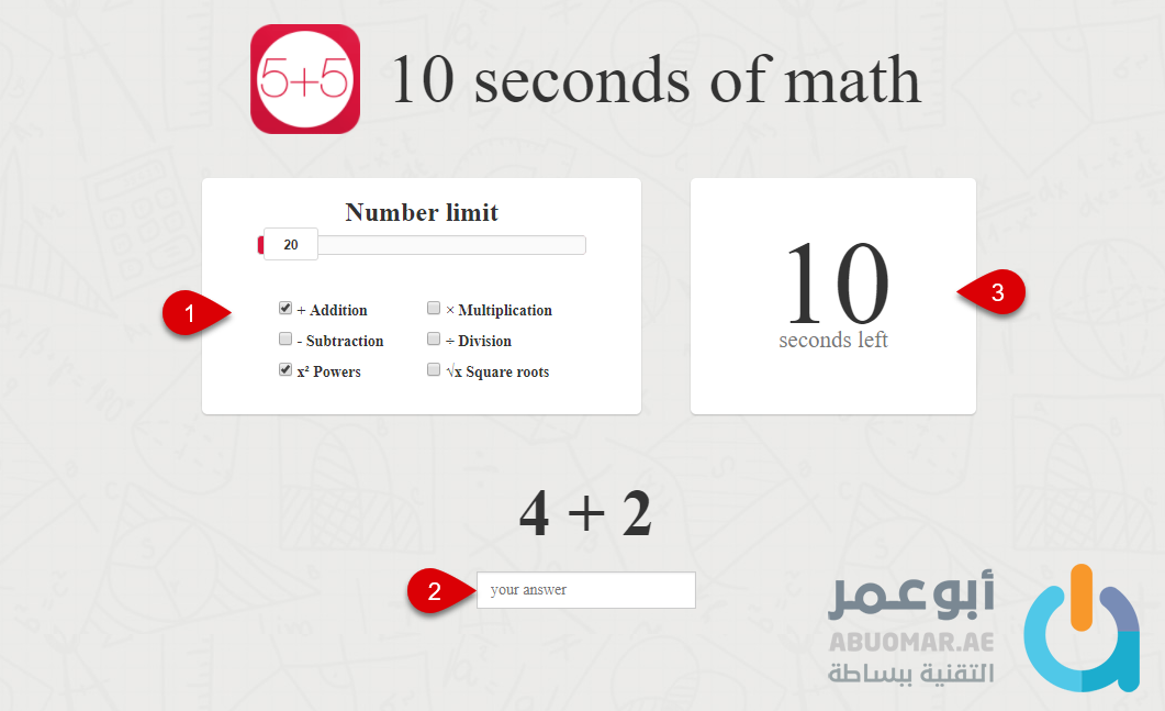 في الخيار رقم 1 يمكنك اختيار نوعيّة العمليّات الرياضيّة التي تريد التدرّب عليها كالضرب والقسمة والجمع وما إلى ذلك وفي الخيار رقم 2 ستقوم كلّ مرّة في إدخال الإجابات الخاصّة بالأسئلة