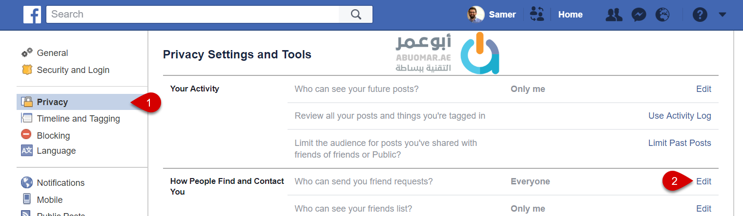 انتقل لتبويب الخصوصية Privacy واضغط على Edit ضمن خيار Who can send you friend requests?