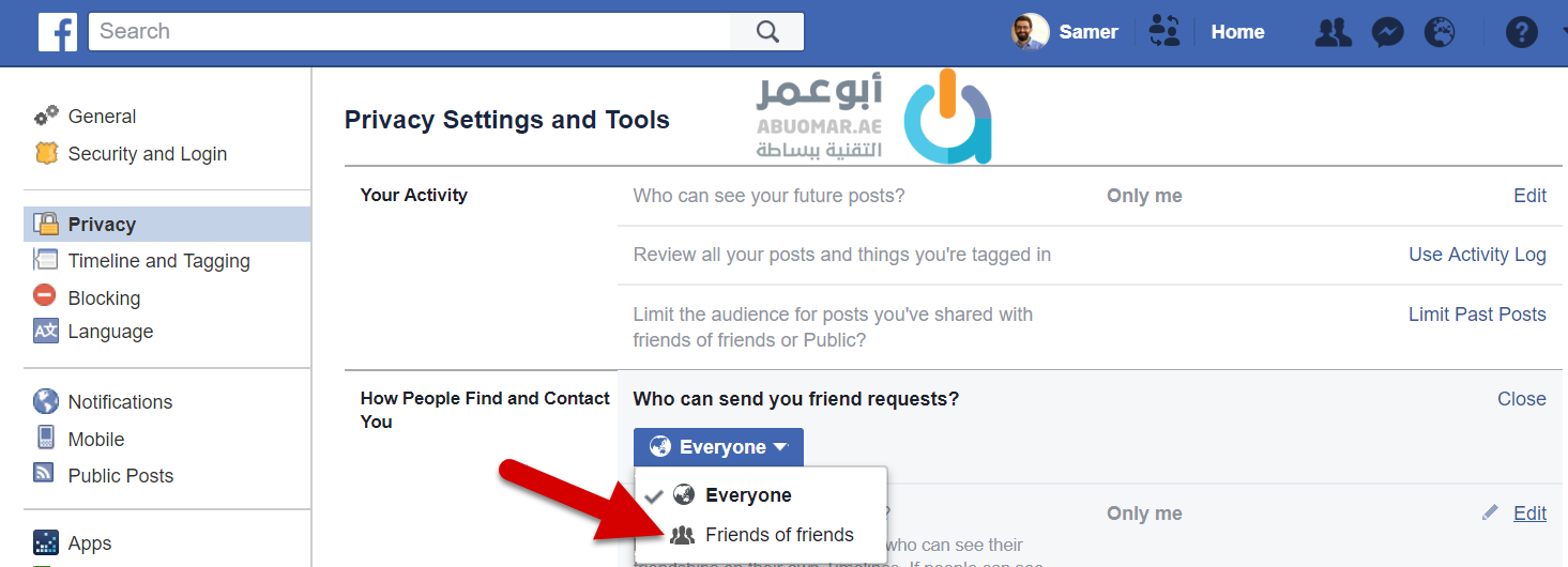 اختر خيار أصدقاء الأصدقاء Friends of Friends بدلاً من الجميع Everyone
